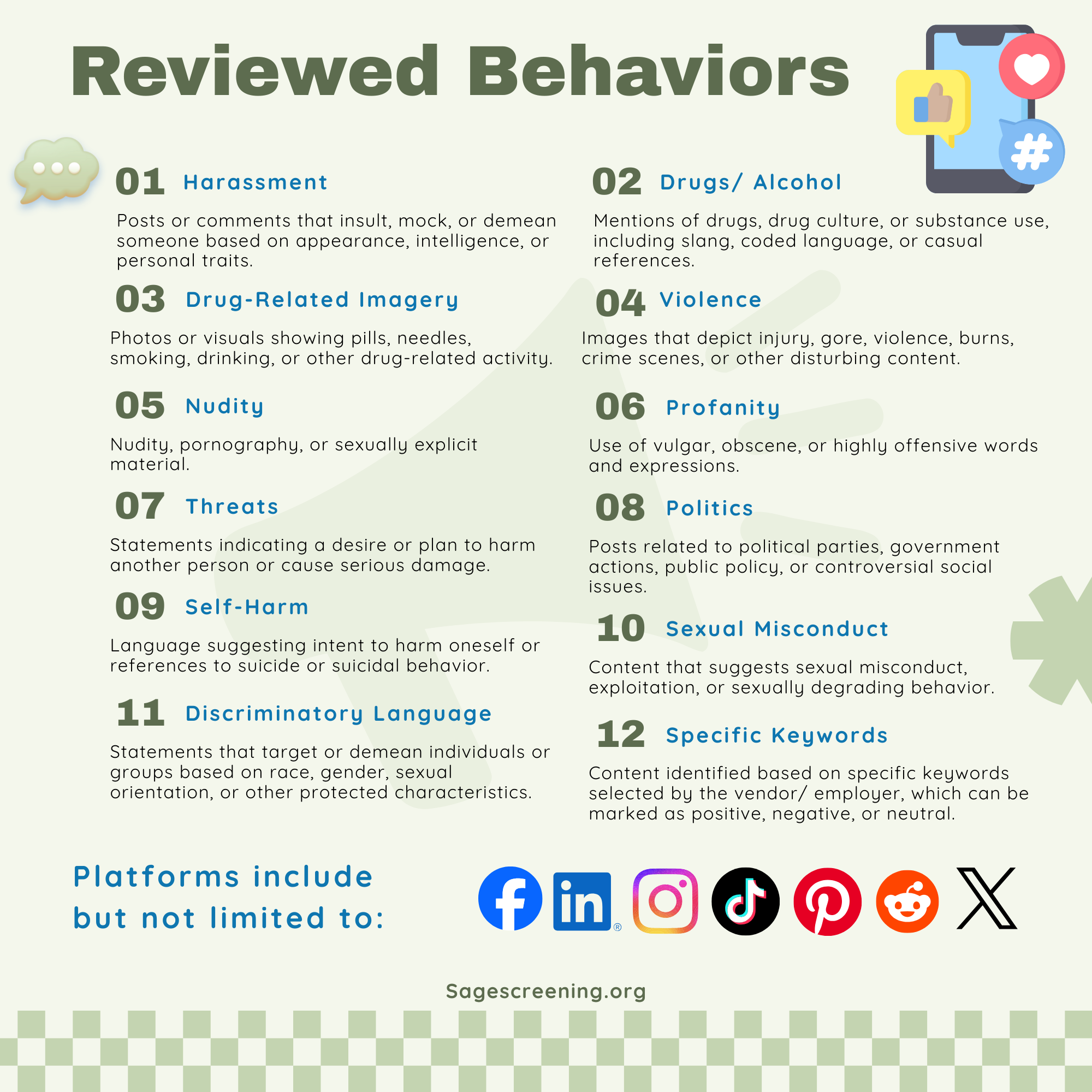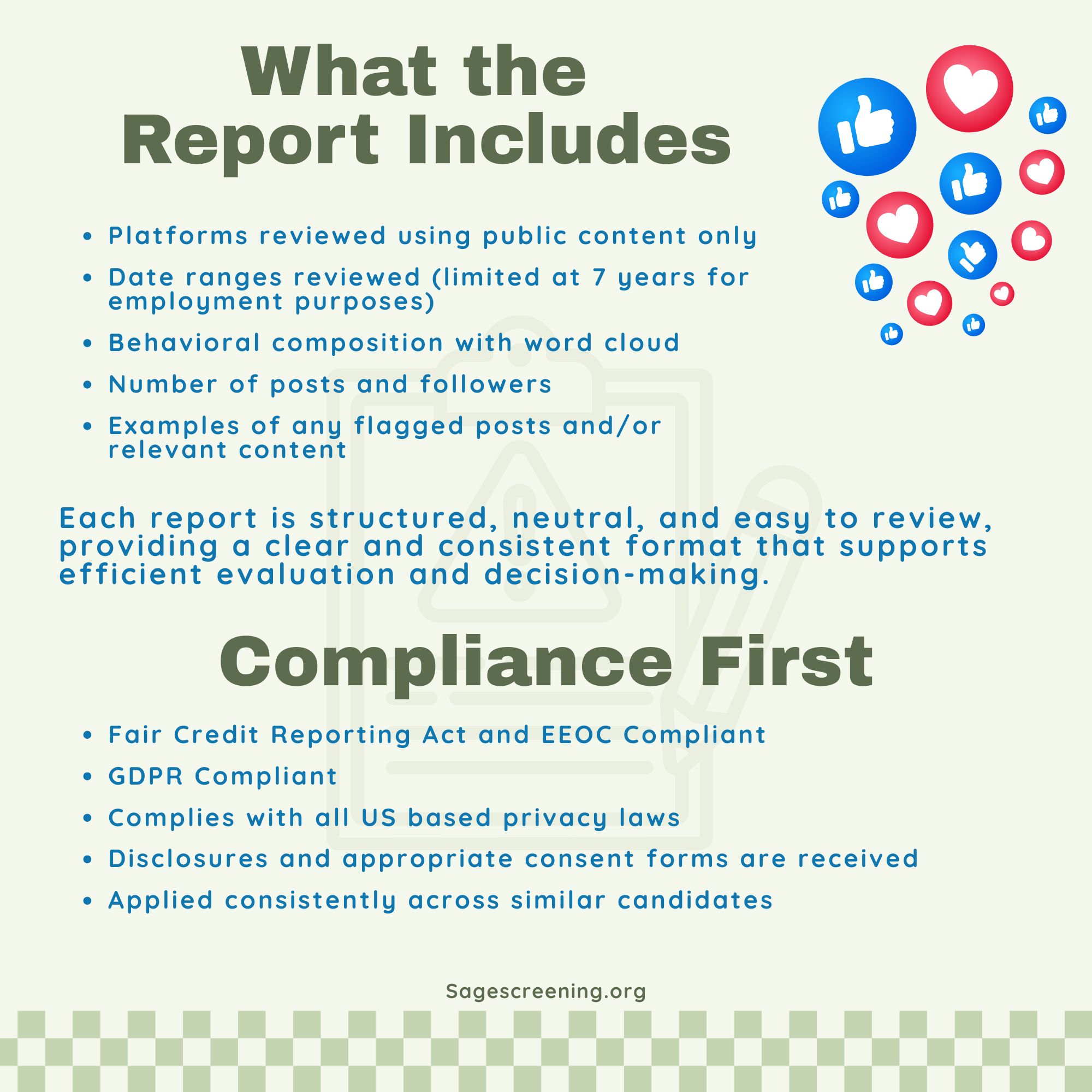 Social media screening reviews publicly available information only and does not include private communications, password protected content, or protected class analysis. Sage Screening does not make hiring decisions or recommendations.